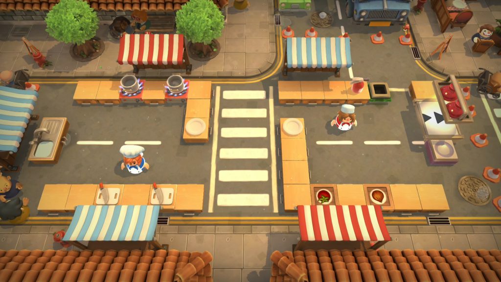 画面中央の横断歩道では通行人が調理の邪魔をしてきます。通行人は必ず右側通行です。通行人を押すことはできませんので流れに逆らわずうまくかいくぐりましょう。